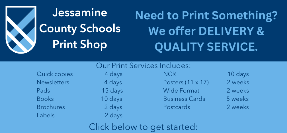 The Print Shop is located at the Jessamine Career & Technology Center, Room 147, 881 Wilmore Road, Nicholasville, KY 40356